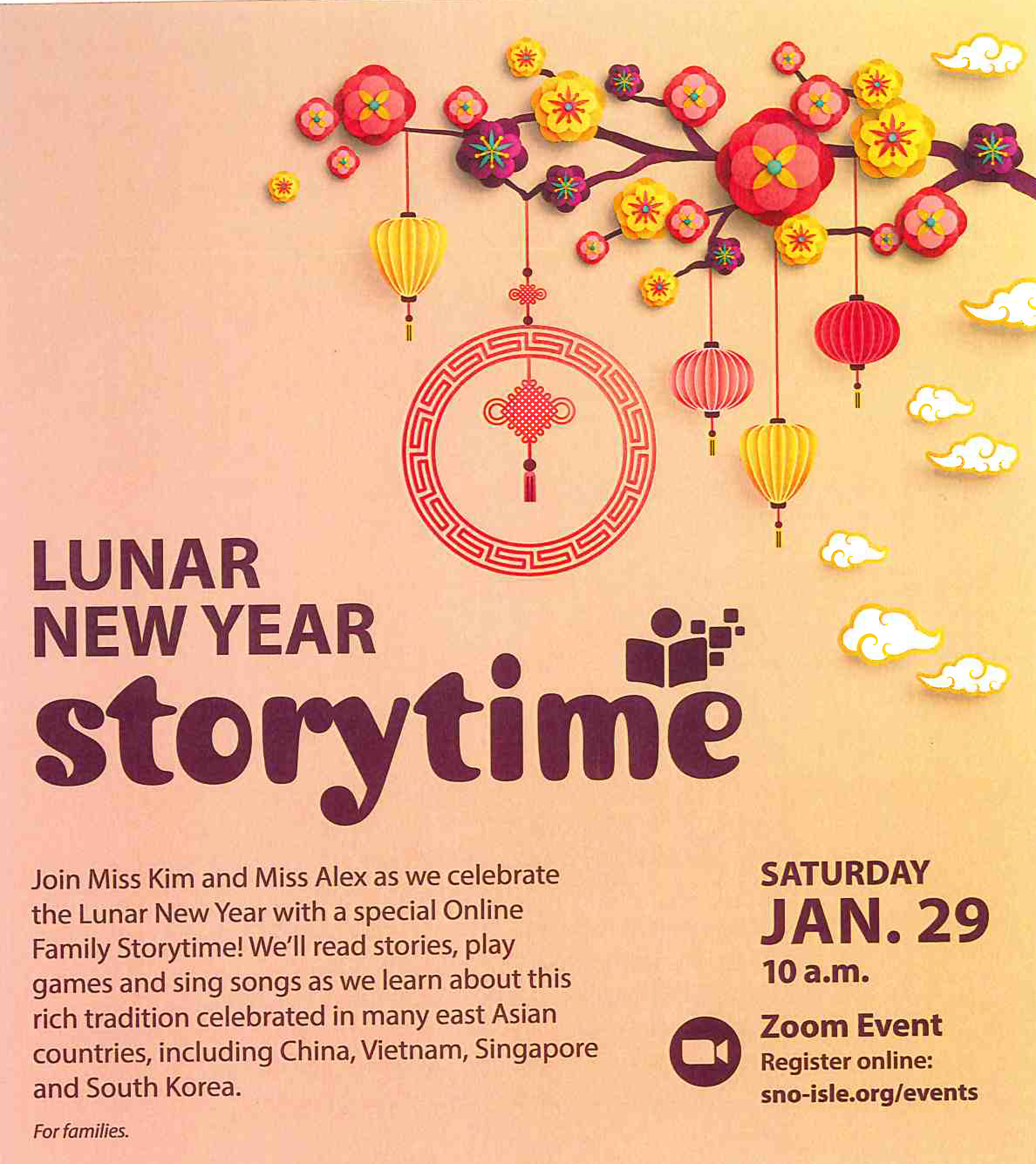 Join Miss Kim and Miss Alex as we celebrate the Lunar New Year with a special Online Family Storytime! We’ll read stories, play games and sing songs as we learn about this rich tradition celebrated in many east Asian countries, including China, Vietnam, Singapore and South Korea.